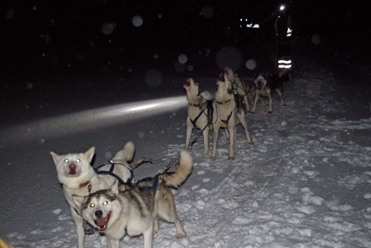 Matkan kohokohta oli koiravaljakko ajelu. Olikin yllätys kun jouduttiin ihan hommiin. Saatiin kokohaalarit, saappaat ja muut asusteet järjestäjältä. Kolme rekeä lähti matkaan. Ennen sitä meidän piti laittaa oman reen koirille valjaat ja kiinnittää ne reen eteen. En osaa kuvailla sitä koirien innostusta, kun näkivät meidät ja saivat valjaat päälle. Homma suju ihmeen hyvin, koirat olivat tosi innokkaita, kilttejä ja vahvoja. Joten valjaat saatiin kylmästä viimasta huolimatta niiden kuuden päälle, jotka vetivät meidän rekeä. Ohjastajan hommana on jarrutella, ettei mennä liian lujaa ja kun on pysähdyttävä saa ihan kunnolla painaa jarrulevyä maahan, että reki pysyi paikoilla. Oli mukavaa hommaa, testattua tuli. Annoin suurimman osan matkaa Riston jarrutella. Reessä istuminen oli aika pomppuisaa. Alkumatkassa näki sinertävät maisemat, mutta loppu matkasta lunta pöllytti sen verran, että näkyvyyttä ei ollut. Kaikkineen reissu oli hieno. Perillä koirat riisuttiin valjaista ja laitettiin omaan aitaukseen. Kuumaa kahvia ja teetä kodassa avotulen ääressä. 4h ja n.12km lenkki, koiravaljakon vetämänä, 110€ hintaan. Kylän raittia tuli talsittua pitkin ja poikin ihmeteltyä autojen suurta määrää vaikka niillä ei kovin kauaksi voi ajaa.