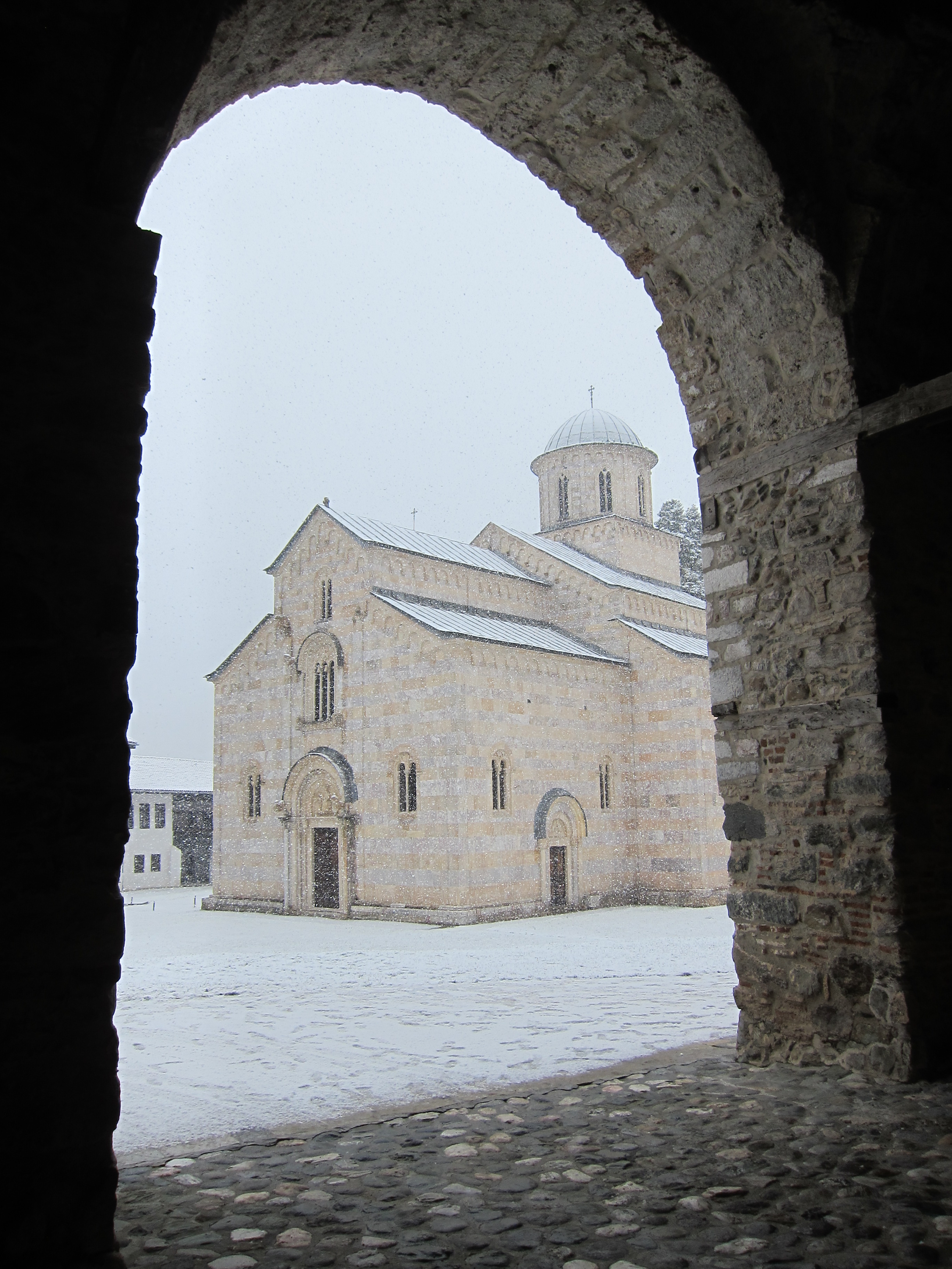 Sunnuntaiaamuna suuntasin kaupungin laidalla olevaan luostariin. Olin jo lukenut oppaasta, sinne mennessä on luovutettava passi vartiomiehille, olivat Serbian poliiseja univormusta päätellen. Luostarin alueen ympäri meni valtava muuri ja itse varsinainen luostari alue oli vielä toisen muurin suojassa. Ortodoksinen pääsiäinen on viikon päästä. Kun saavuin luostarin pihapiiriin, kirkonkellot alkoivat soida. Näin, kirkon ympäri papin johdolla, kävelevän ryhmän. Lähestyessäni yksi heistä tuli luokseni kertomaan, että voin mennä kirkkoon sisälle, tänään on tärkeä päivä 7 päivää pääsiäiseen joten jumalanpalvelus on tärkeä pääsiäiseen liittyvä meno. Sain myös luostarista kertovan esitteen. Oppaassa jota olin tutkinut ennen matkaa, oli kehuttu kirkon freskoja. Olivatkin upeat ja niiden katseluun toi oman hienon fiiliksen laulanta jota ulkona olevat kirkkoa kiertävät ihmiset lauloivat. Hieno paikka.