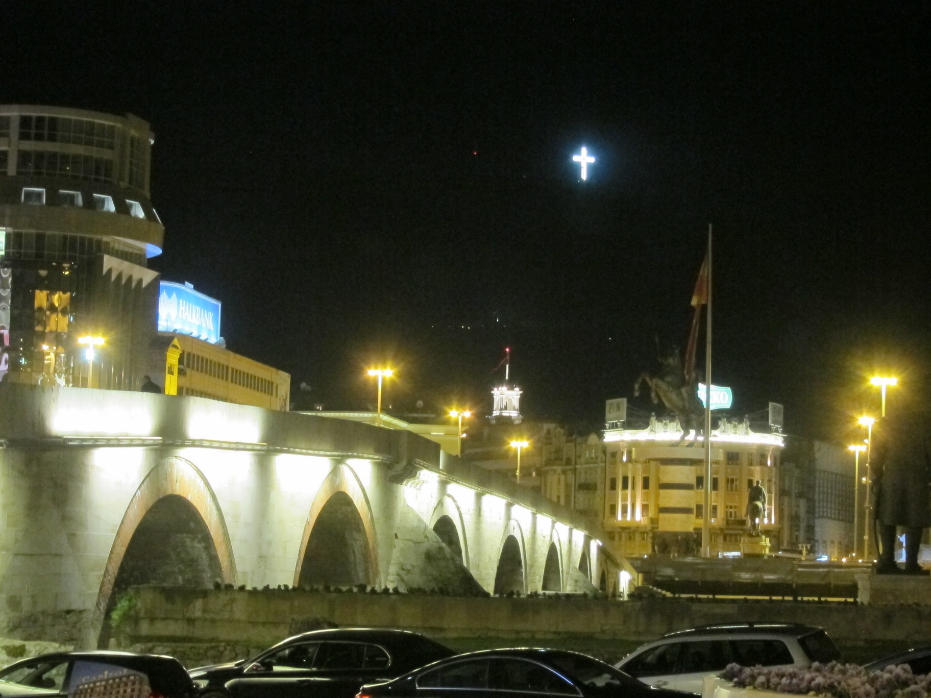Skopjen kaupunkia hallitseva Millennium risti sijaitsee Vodno vuorella, valaisee led valoillaan hienosti illan pimeydessä ristin muotoaan. Näin talvi aikoina, bussit kulkevat n.18 asti ylös paikkaan, josta pääsee gondoli vaunulla huipulle. Viimeinen gondoli lähtö talvisin klo.16-16.30. Lippu maksoi100 eli 1.50€ moisesta ajelusta huipulle ei todellakaan ole paha. Huipulla kaupunkia ei paljon näy, mutta ympäröivät vuoret, nyt kirkkaalla säällä hienot lumihuiput, näin keväällä peitti korkeimpia huippuja. Myös ristin juurella oli lunta. Oli kiva käydä ristin juurella ja nähdä sen valtava koko. http://fi.wikipedia.org/wiki/Millennium_Cross