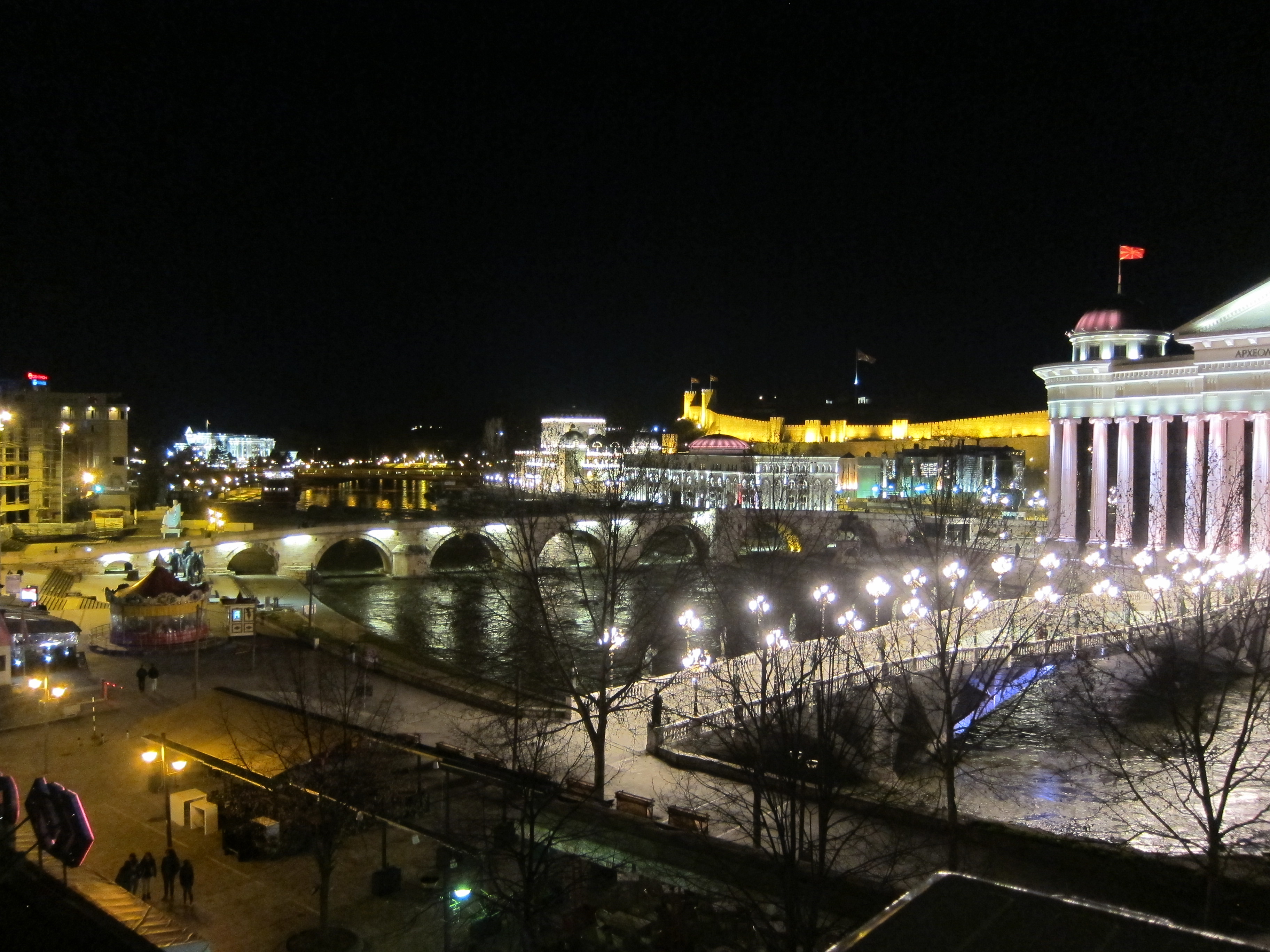 Yhtenä iltana suuntasin Arka hotellin yläkertaan katsomaan auringonlaskua ja valojensyttymistä kaupunkiin. Aina niin erilainen kokemus on nähdä kaupungin valomeri ylhäältä. Skopjessa vielä Millennium ristin loistaminen ylhäällä teki vaikutuksen