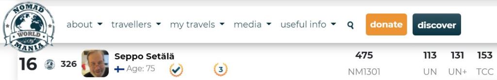 Nomadmanian listalla Seppo oli kuollessaan Suomen 16. eniten matkustanut ihminen (Nomadmanian 1301:n alueen rankingillä).