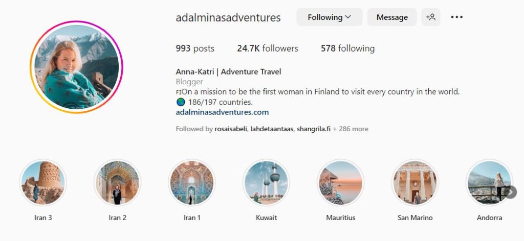 Anna-Katrin yhteenvedon koskien erityisesti kaikissa maissa käyneitä naisia ja paljon matkailleita suomalaisia naisia voi lukea tästä. Matkakertomuksia Adalmina’s Adventures -blogissa on nykyisin vähemmän, sillä hänen pääkanavansa on nykyisin Instagram, erityisesti Instagram Stories.