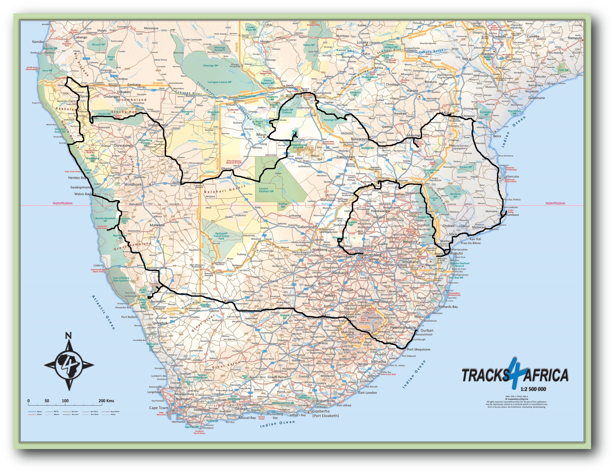 Durbanista matka jatkui autolla monen Afrikan maan halki useamman kuukauden ajan. Seuraavissa kuvissa Harrin seurueen käyttämä auto, joka 14 litraa sadalla kulutuksestaan huolimatta oli mahtava tähän tarkoitukseen ja ajettu reitti. Autolla ajettujen maiden lisäksi reitille osui pari maavierailua kävellen, eli käynnit Angolassa ja Eswatinissa.