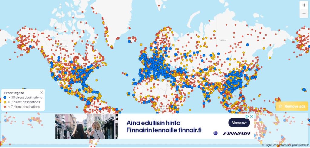 Pirkon mainitsema Flight Connections -sivusto löytyy tästä. Sivustolta voi zoomata itsensä haluamaansa kohteeseen ja napauttamalla kyseisen lentokentän kuvaa näkee suorat yhteydet kyseiseltä kentältä.