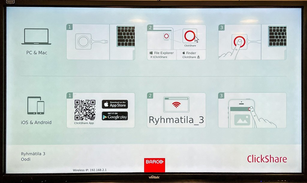 Jos haluat Oodissa jakaa materiaalia puhelimelta tai tabletilta, niin lataa etukäteen ClickShare-sovellus, katso oheinen kuva:
