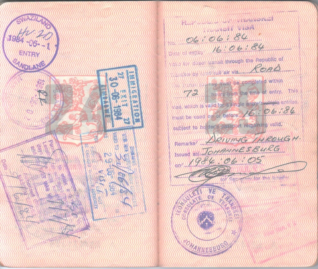 *) Kokouksen jälkeen Eki täsmensi tätä vielä näin: Etelä-Afrikka(kin) vaati viisumin. Se oli irrallinen paperi kuten Israelin ja Venäjän viisumit tänään. Sillä pääsi kaikkiin naapurimaihin paitsi Mosambikiin. Syy irralliseen paperiin oli, että jos kyseisen maan viisumi löytyy passista, maahantulo tiettyihin toisiin maihin estyy. Myös Sambia vaati viisumin.