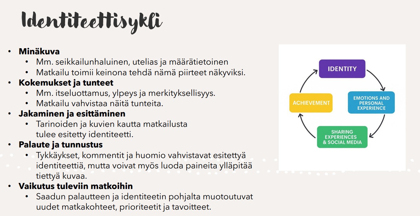 Emman esittelemä Identiteettisykli, jossa aloitetaan matkailun pariin tavalla tai toisella ohjanneesta minäkuvasta ja jatketaan onnistuneiden kokemusten vahvistamaan itseluottamukseen, kokemusten jakamiseen, palautteeseen ja saadun palautteen vaikutuksella tuleviin matkoihin tuntui kyllä tutulta sikäli, että juuri tätähän Maailmanmatkaajien kokouksissa ja jossain määrin esimerkiksi Facebook-ryhmissä tehdään, kerrotaan toteutuneista matkoista ja käytetään toisten kokemuksia omien seuraavien matkojen kimmokkeena.