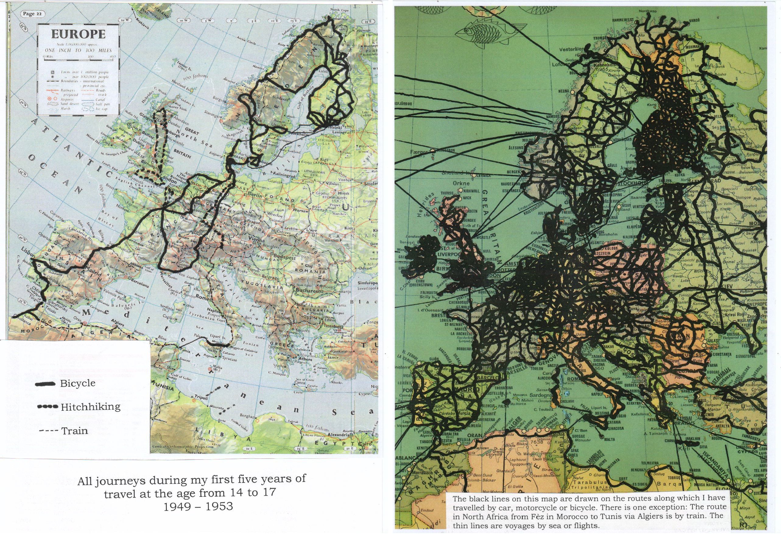 Tästä alkoi läpi elämäni jatkunut tapa piirtää kaikki kulkemani tiet mustalla eri maiden karttoihin. Pyrkimys täyttää kartat mustilla viivoilla oli minulle tärkeintä. Maita ja alueita tuli ikään kuin sivutuotteena. Yöpyessäni pyörämatkallani retkeilymajoissa tutustuin moniin peukalokyydillä kulkeviin nuoriin opiskelijoihin. Heistä muutamat kertoivat olevansa reissullaan tulossa Helsinkiin. Keksin kutsua heidät yöpymään luonamme. Kolme tuli ja he vuorostaan kutsuivat minut luokseen Hollantiin, Pariisiin ja Cambridgeen.